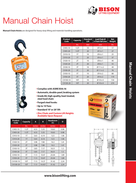 Regular priceFrom $176.95Unit priceUnavailableBison Manual Hand Chain Hoist - .5 Ton to 10 Ton - 10 ft and 20 ft Lift Chain