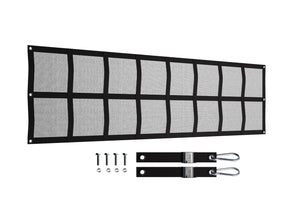- Install with the included screws and lock nuts, tensioning straps evenly to reduce sag.