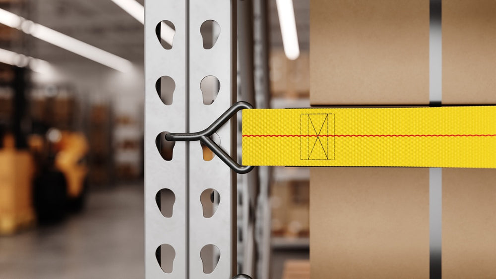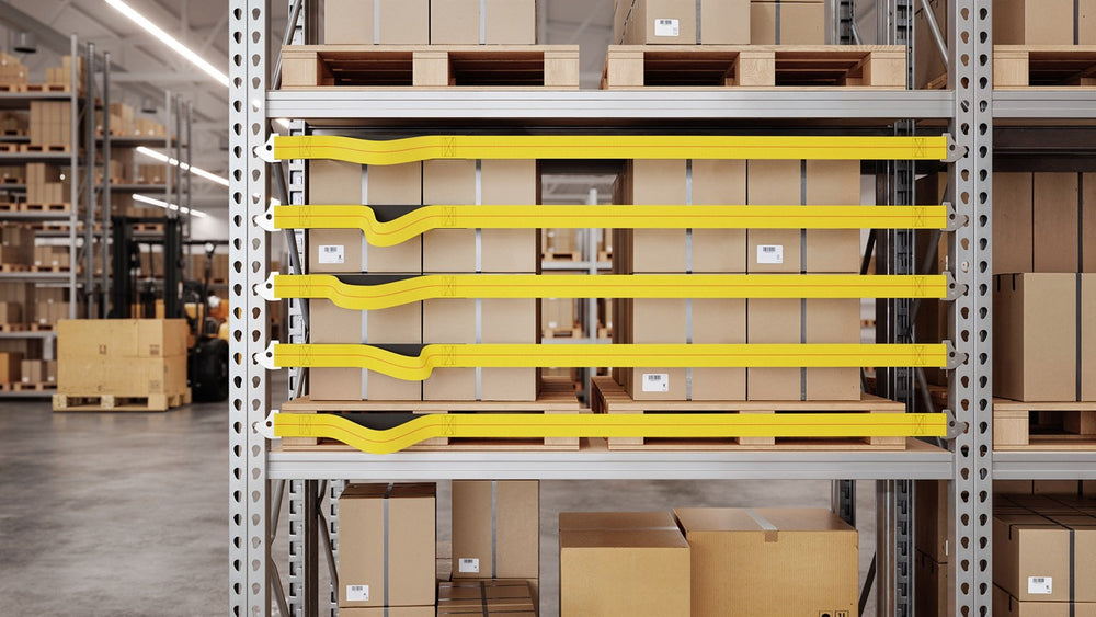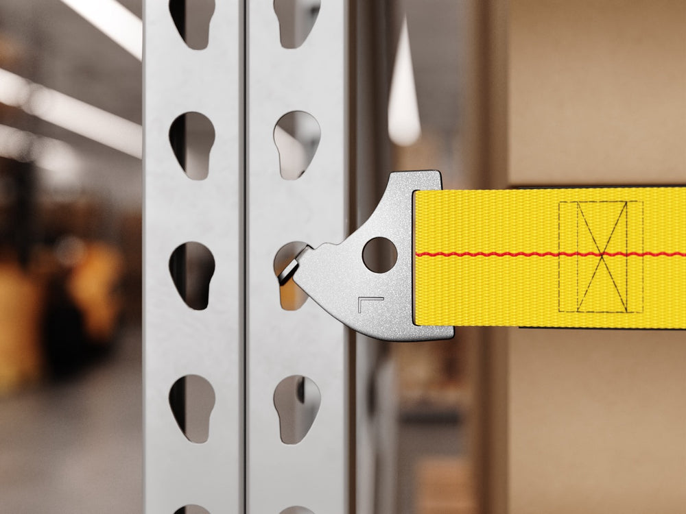 StretchGuard pallet rack safety straps create a visible, flexible barrier that helps stop cartons or pallets from pushing into the flue space or falling out of a rack bay. Each strap uses 2 inches wide polyester cargo webbing with integrated elastic so it can accommodate up to 6 inches of overhang. High-visibility safety yellow webbing makes inspections quick, and tool-free end fittings snap into place in seconds.