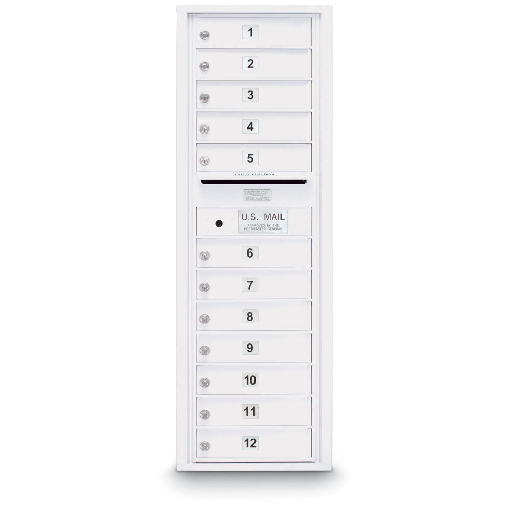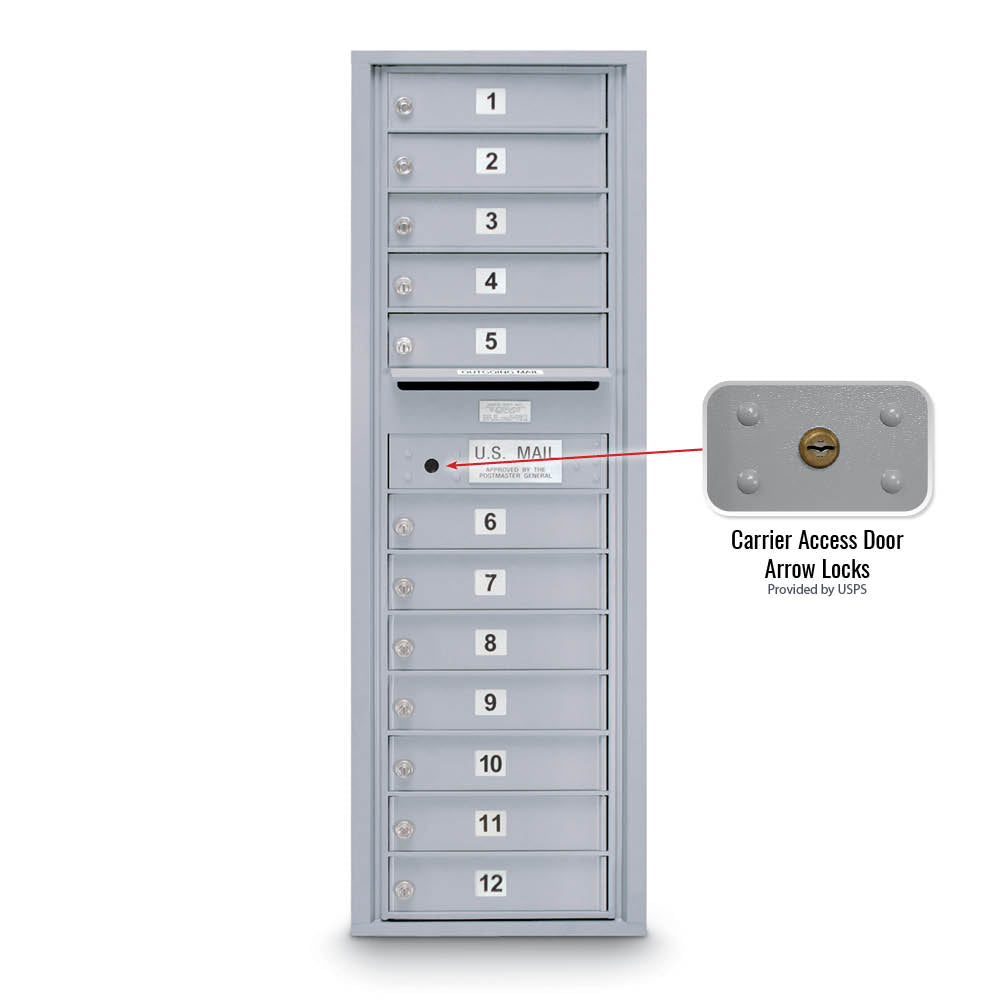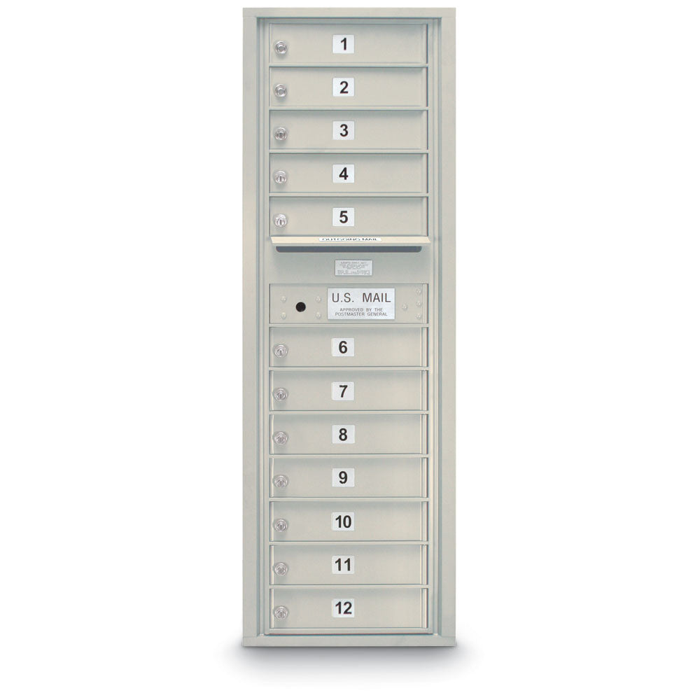 12-door high-security 4C Standard Mailboxes are constructed of high-quality heavy gauge aluminum with stainless steel components for maximum durability both indoors and out with a shelter. A corrosion-resistant, weatherproof powdercoat finish protects the secure units from the elements, while the riveted shelves and concealed hinges limit pry points offer this mailbox unit extra security. The Carrier Access Door provides easy access for Postal Letter Carriers to release the master loading doors.