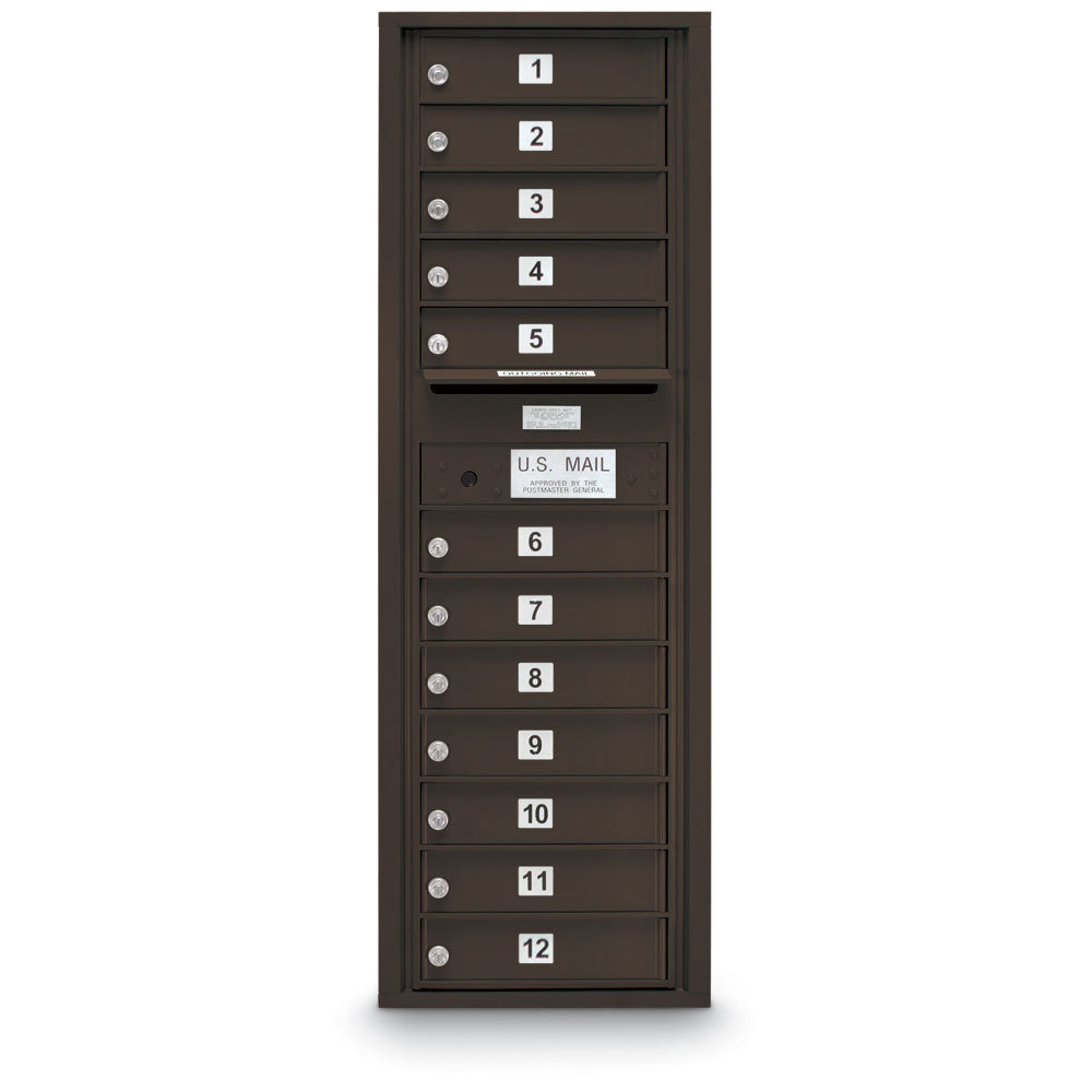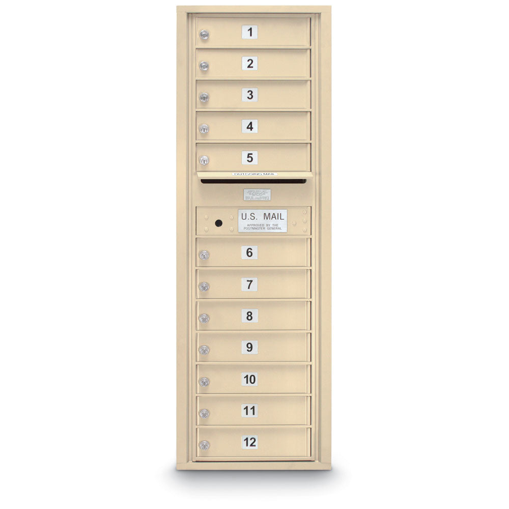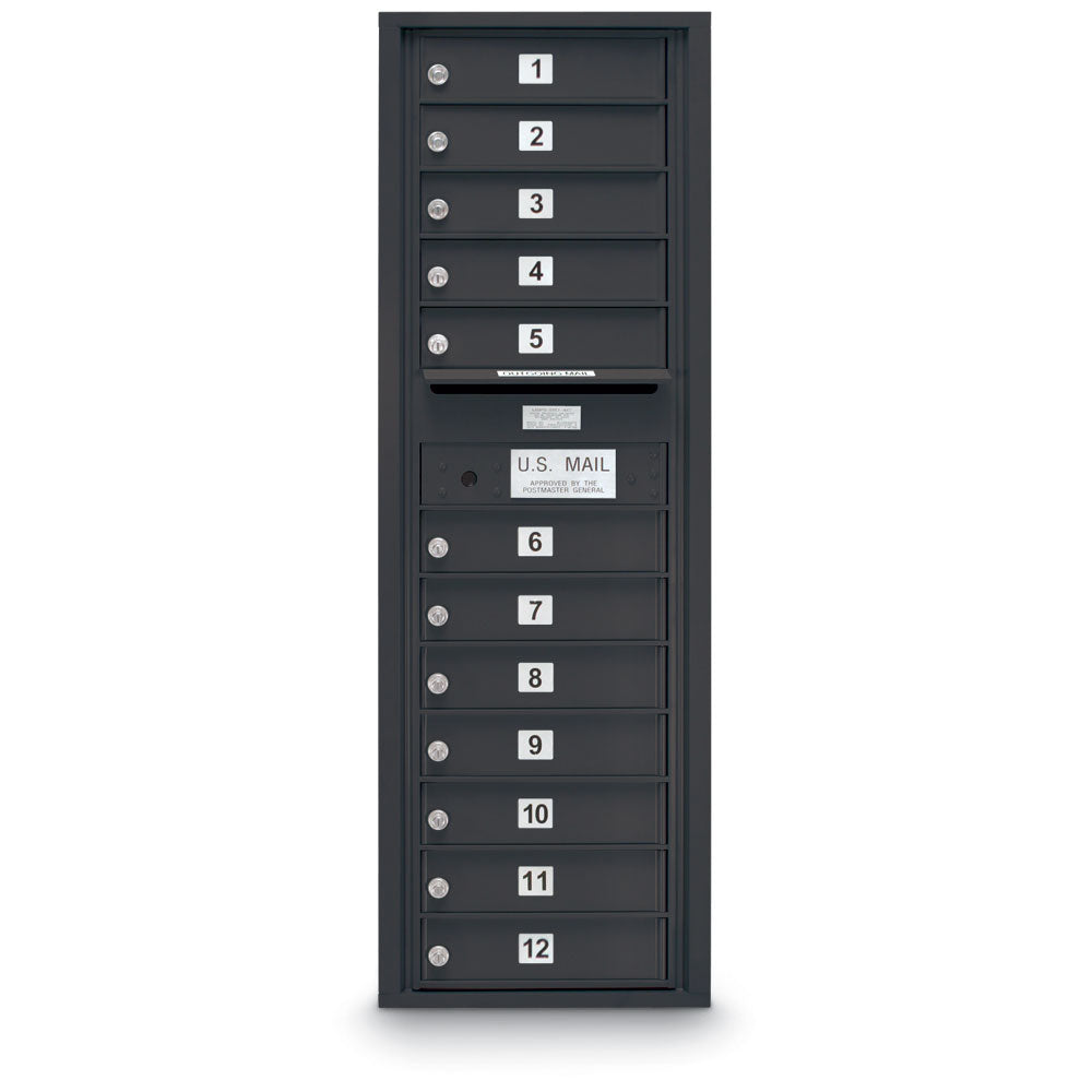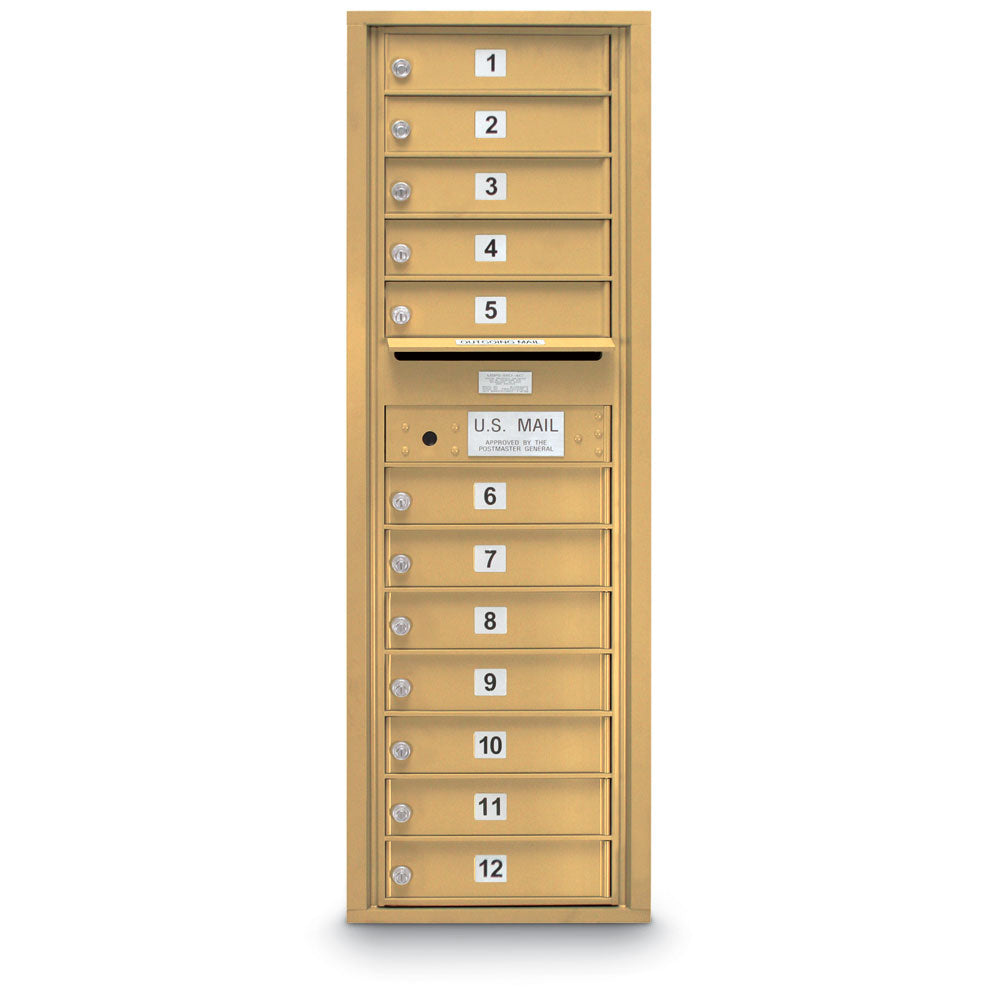 12-door high-security 4C Standard Mailboxes are constructed of high-quality heavy gauge aluminum with stainless steel components for maximum durability both indoors and out with a shelter. A corrosion-resistant, weatherproof powdercoat finish protects the secure units from the elements, while the riveted shelves and concealed hinges limit pry points offer this mailbox unit extra security. The Carrier Access Door provides easy access for Postal Letter Carriers to release the master loading doors.