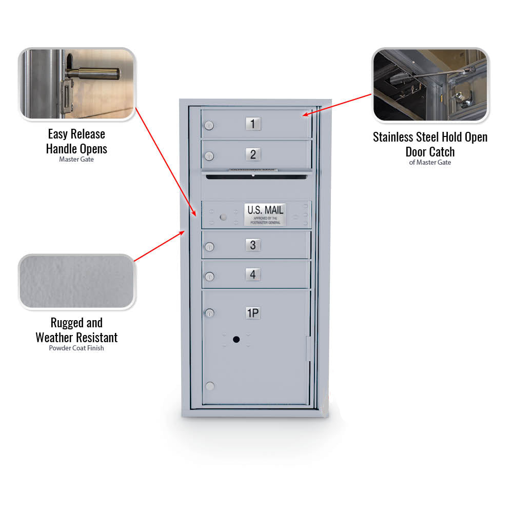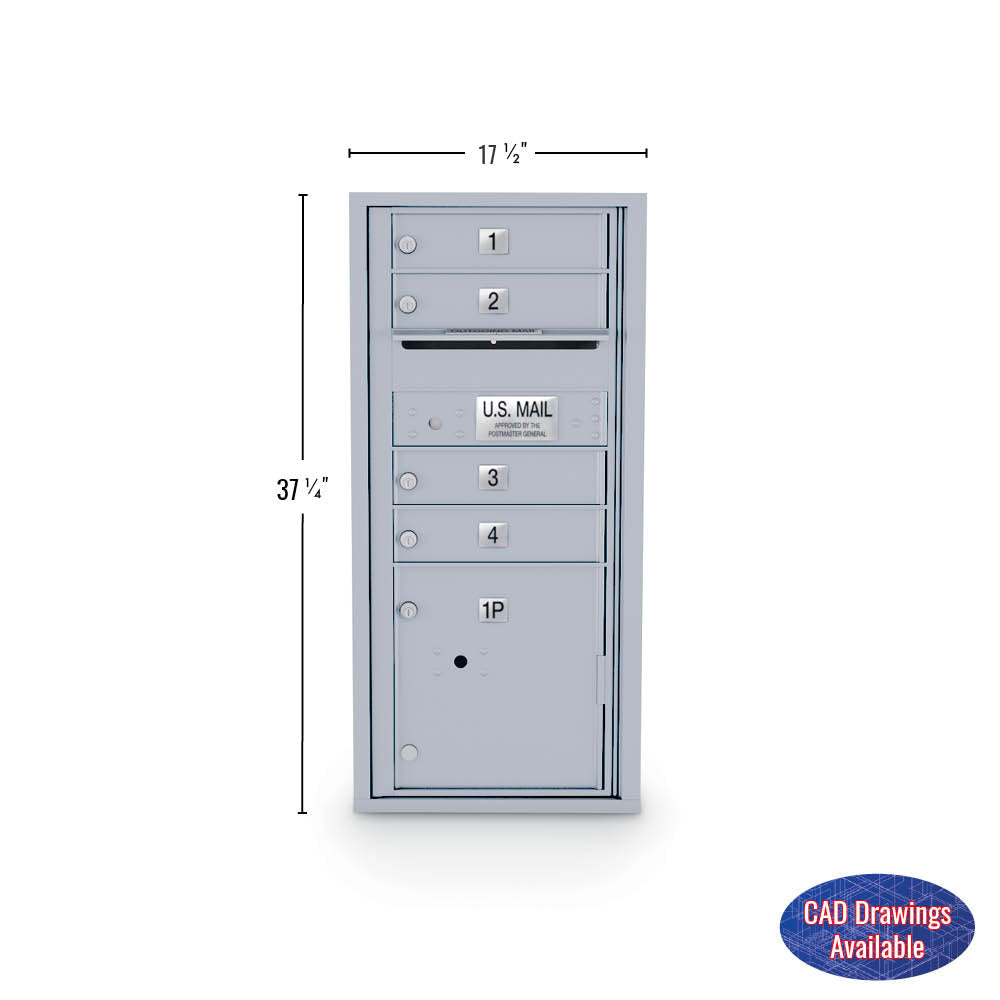 4 Door Standard 4C Mailbox with 1 Parcel Door - Silver Powder Coat is backordered and will ship as soon as it is back in stock.