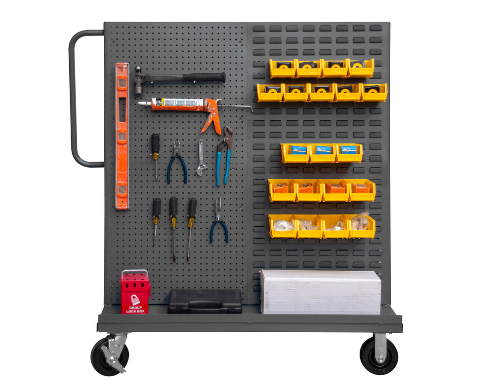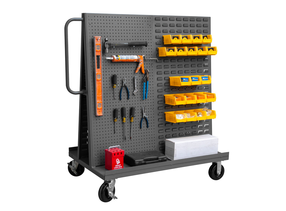 This A-frame cart features versatile dual-side panels. Sides are a hybrid of a louvered panels and pegboards, simplifying the hanging and storing of various tools and bins.