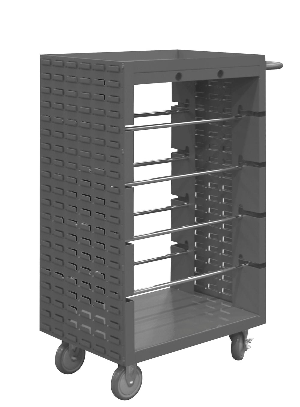 Packed with sturdy 5" x 1-1/4" polyurethane casters, our mobile wire spool cart comes with two stationary and two swivel movements with brakes on the side. It features an array of 8 metal rods, a pair of louvered panels on each side for optional usage of hook-on-bins, and a tubular push handle. The cart has a muted gray tone.