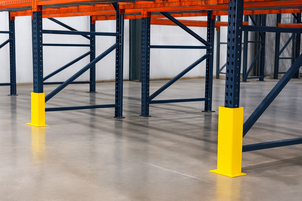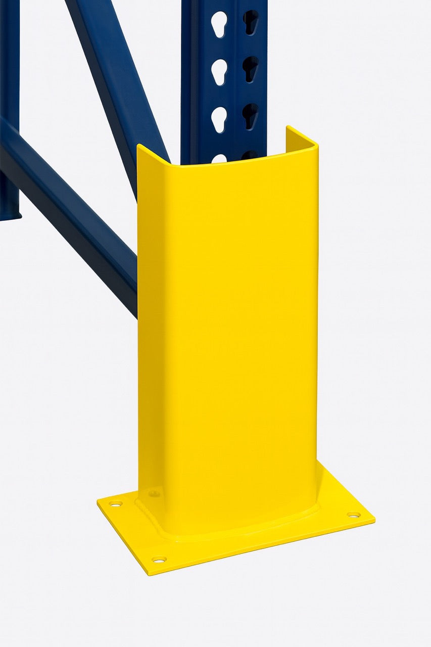These heavy duty pallet rack column guards shield upright posts from forklift and pallet jack strikes. Built from 3/16 in thick steel with a robust floor-mounted design, they install in minutes and deliver long-term protection in high-traffic aisles.
