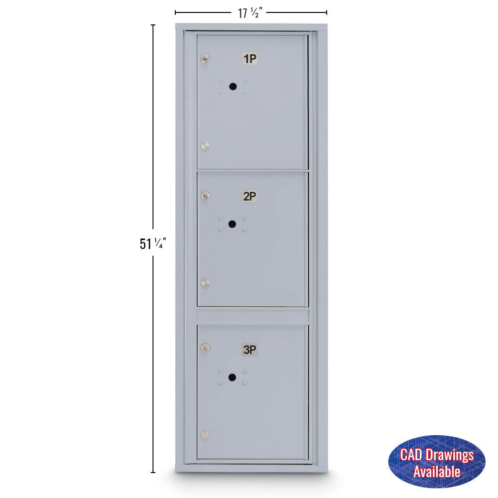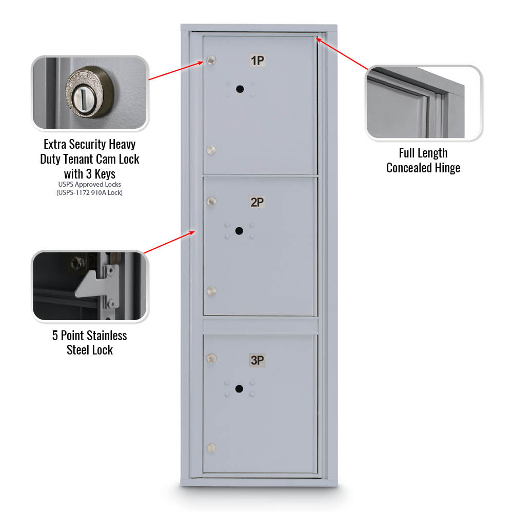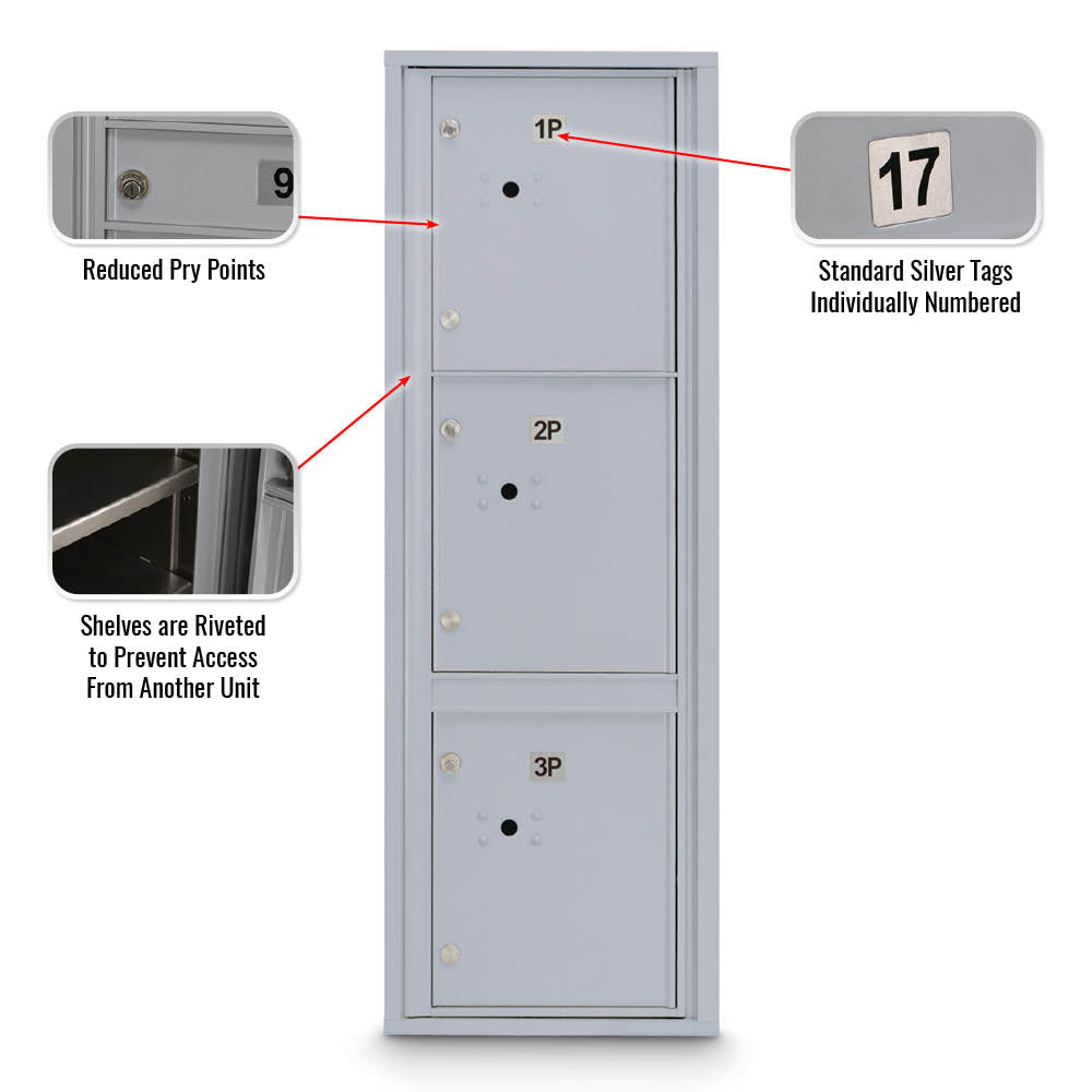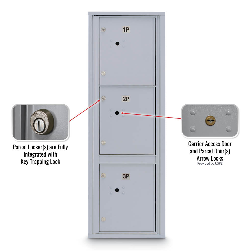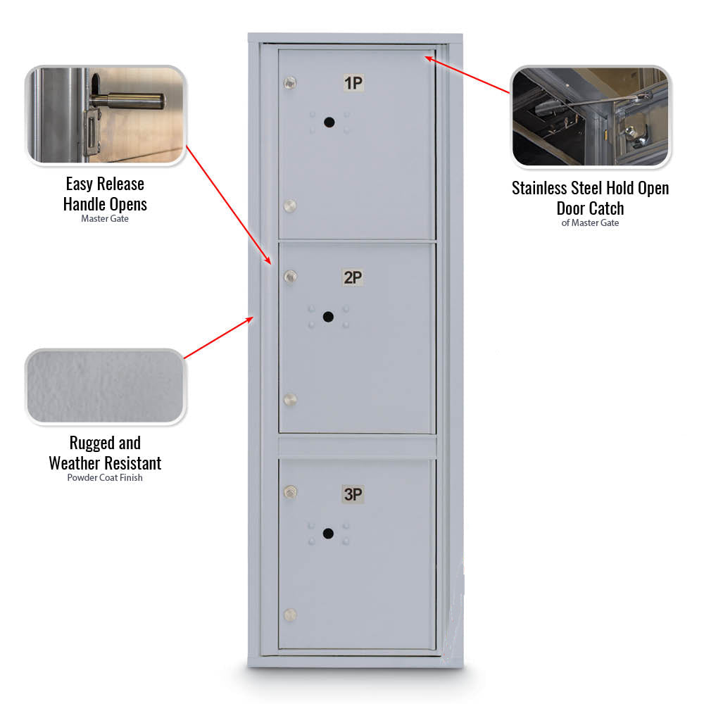 The 4C Standard Mailboxes are constructed of high-quality heavy gauge aluminum with stainless steel components for maximum durability both indoors and out with a shelter. This 3 Parcel Locker unit allows for maximum delivery capabilities and storage of large packages.The corrosion-resistant, weatherproof powdercoat finish protects the units from the elements, while the riveted shelves and concealed hinges limit pry points for extra security. Carrier access door provides easy access for Postal Letter Carriers to release the master loading doors.