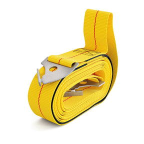 Key specs: 2 inches wide polyester cargo webbing with integrated elastic; color: safety yellow; approximate 2,400 lb burst strength; available bay widths: 48, 96, 102, 108, 120, 144, or 156 inches; attachments: Teardrop or J-Hook.