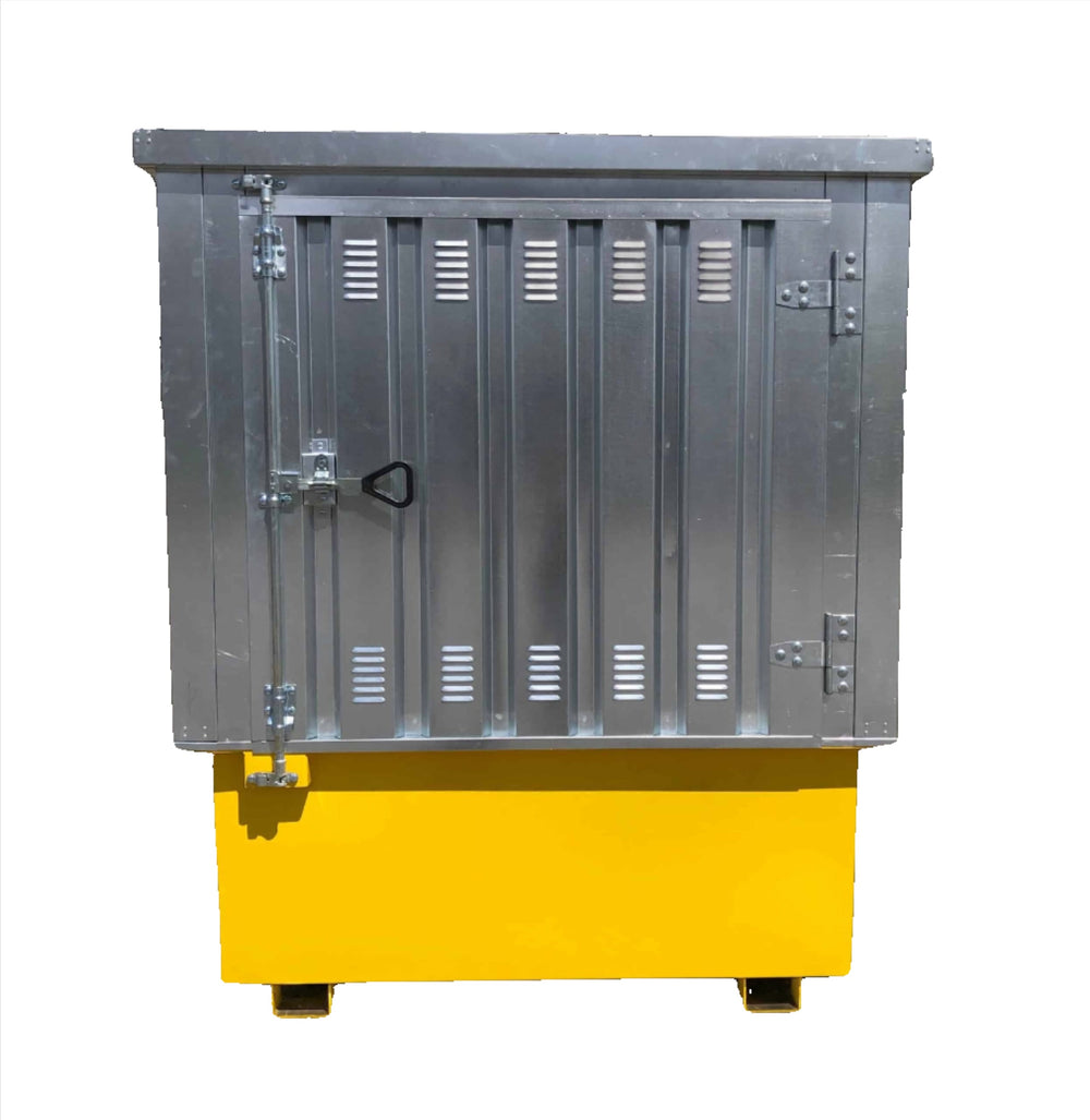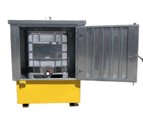 - Secure storage and spill containment for one IBC tank or tote, featuring a lockable door to deter unauthorized access.