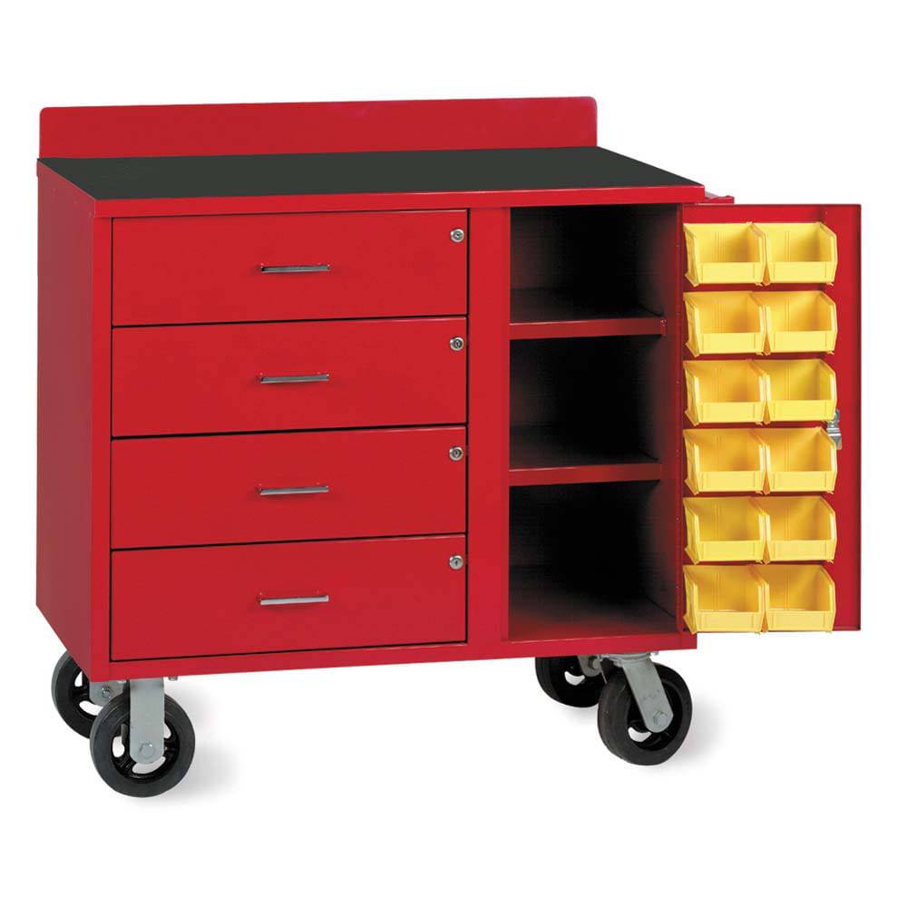 The innovative design features four drawers and one door, ideal for maintenance shops, open floor workstations, etc. Each drawer, featuring superior drawer glides and ball bearings, offers a capacity of 100 lbs and a 5" height. The door incorporates two interior shelves and bin brackets for the accompanying storage bins (4 1/8"W x 5 1/2"D x 3"H). Each compartment can be locked individually, keeping specific items secure while others remain accessible. They are keyed-alike for convenience. Also, there's a 3" raised back lip and an inclusive vinyl non-slip mat to prevent items from falling off. For easy maneuverability, the right side of each workbench is equipped with a welded handle that extends 5". Resting on four 5" non-marking rubber casters (2 rigid, 2 swivel), these workbenches can be easily moved.
